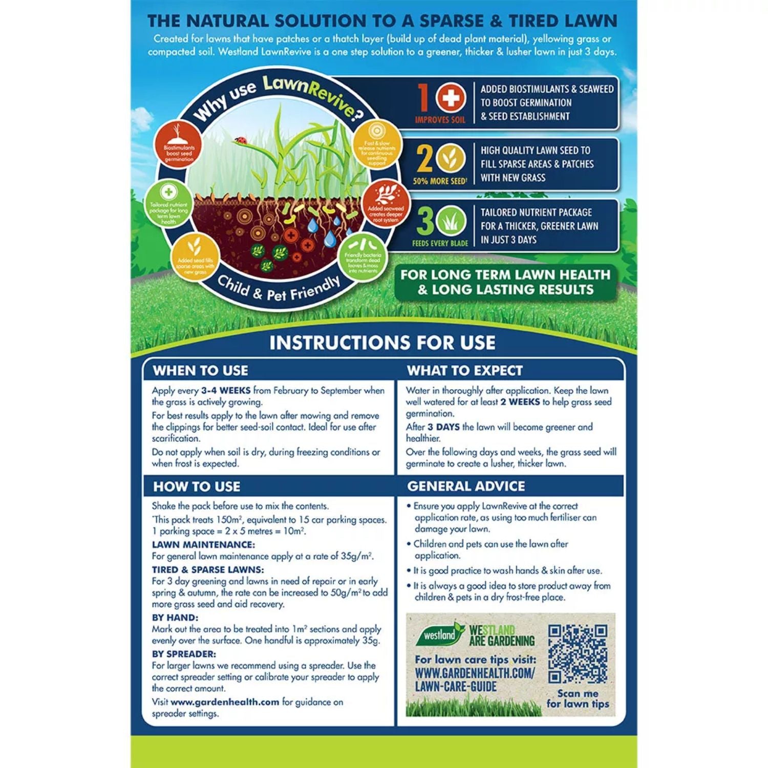 Westland Lawn Revive is a one step natural solution for a greener, thicker and lusher lawn. It has been created for lawns that have patches or a thatch layer (build up of dead plant materials), yellowing grass or compacted soil. It is a new generation of fertiliser and soil enhancer with the highest seed content in the market therefore it is the ultimate lawn thickener.