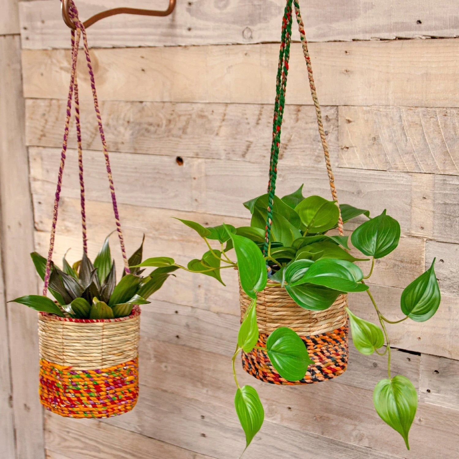 Revitalise your garden with the Small Cylindrical Artisan Hanging Plant Basket from Wildlife World. Crafted from Hogla, an invasive seagrass, and adorned with vibrant upcycled saris, this Fair-Trade masterpiece adds a touch of sophistication to your outdoor haven.