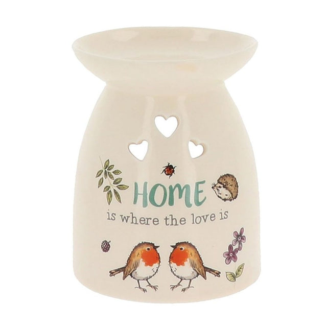 Bring warmth and personality into your living space with the Shudehill Woodland 'Home' Robin Oil Burner. Crafted from smooth ceramic, this burner showcases beautifully illustrated robins, floral details and woodland motifs, making it a lovely decorative piece even when not in use. The trio of heart-shaped cut-outs allows candlelight to shine through, creating a gentle, ambient glow while your chosen fragrance fills the room.